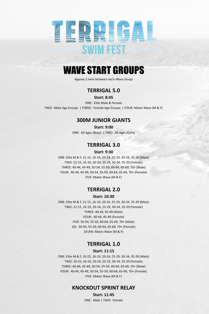 | 9:00am | 300m Junior Giants Start | @ Start Zone – Terrigal Beach |